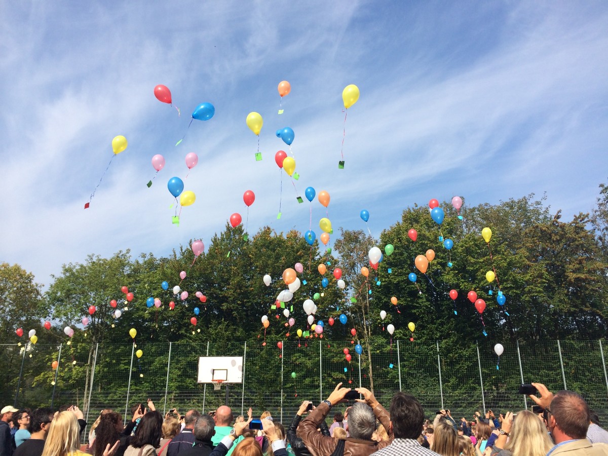 Gemeinsam mit den neuen Klassenlehrern und den Familien ging es abschließend auf den Sportplatz. Dort ließen die Schüler bei strahlendem Sonnenschein Luftballons mit ihren Wünschen für die kommende Schulzeit in den Himmel steigen. Wer nun eine kleine Stärkung gebrauchen konnte, bekam die vom Förderverein, der sich in der Eingangshalle vorstellte und Getränke und Würstchen anbot. Nach einem Abstecher in die Klassenräume ging ein aufregender erster Schultag für die neuen Schüler der Schule zu Ende.