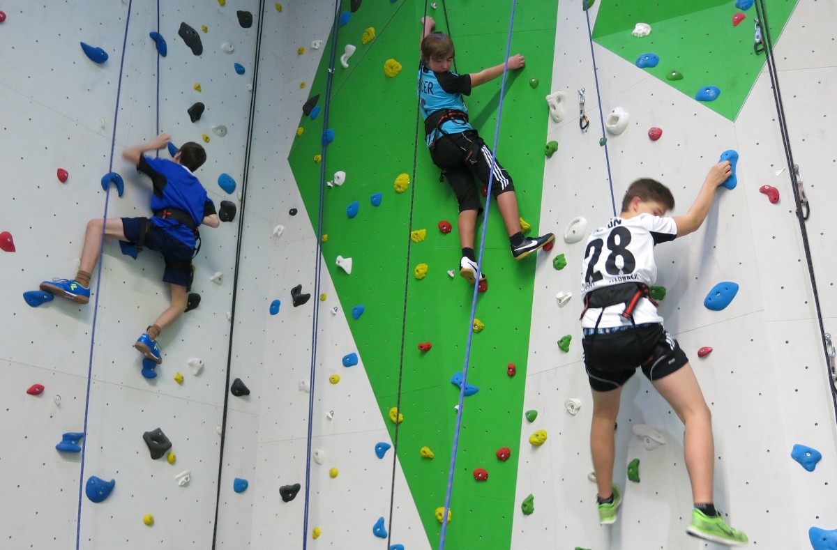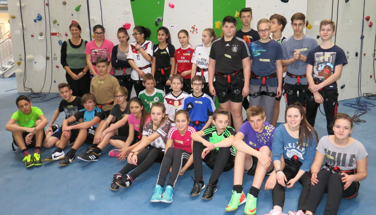 Klettern heißt die eigenen Grenzen erleben, Ängste überwinden, seinen Partnern vertrauen, im Team zu arbeiten und natürlich jede Menge Spaß. Und den hatten die 29 Schülerinnen und Schüler der Klasse 8d einen Tag vor Ausgabe der Halbjahreszeugnisse. Unermüdlich versuchten die einzelnen Gruppen innerhalb ihres Teams die bis zu 16 Meter hohen Wände zu erklimmen und dabei die Schwierigkeitsgrade der gesteckten Routen zu steigern. Am Ende wurde auch der Boulderbereich noch ausgiebig genutzt. Die Stimmung jedenfalls war super und jeder hochkonzentriert bei der Sache. So wunderten sich Sarah und Elif, das ihre angekündigte Höhenangst sich peu á peu auflöste und sie wie alle anderen schließlich oben in den Seilen hingen. Ausgebildete Trainer standen immer mit Rat und Tat zur Seite, machten Mut und gaben jedem Sicherheit. Deren anschließendes Lob in der Feedback-Phase an unsere Schüler rundete den Vormittag ab. Das Schnuppern der Höhenluft tat allen gut und hat die Klasse wieder ein Stückchen mehr zusammengeschweißt. Was will man eigentlich mehr?
