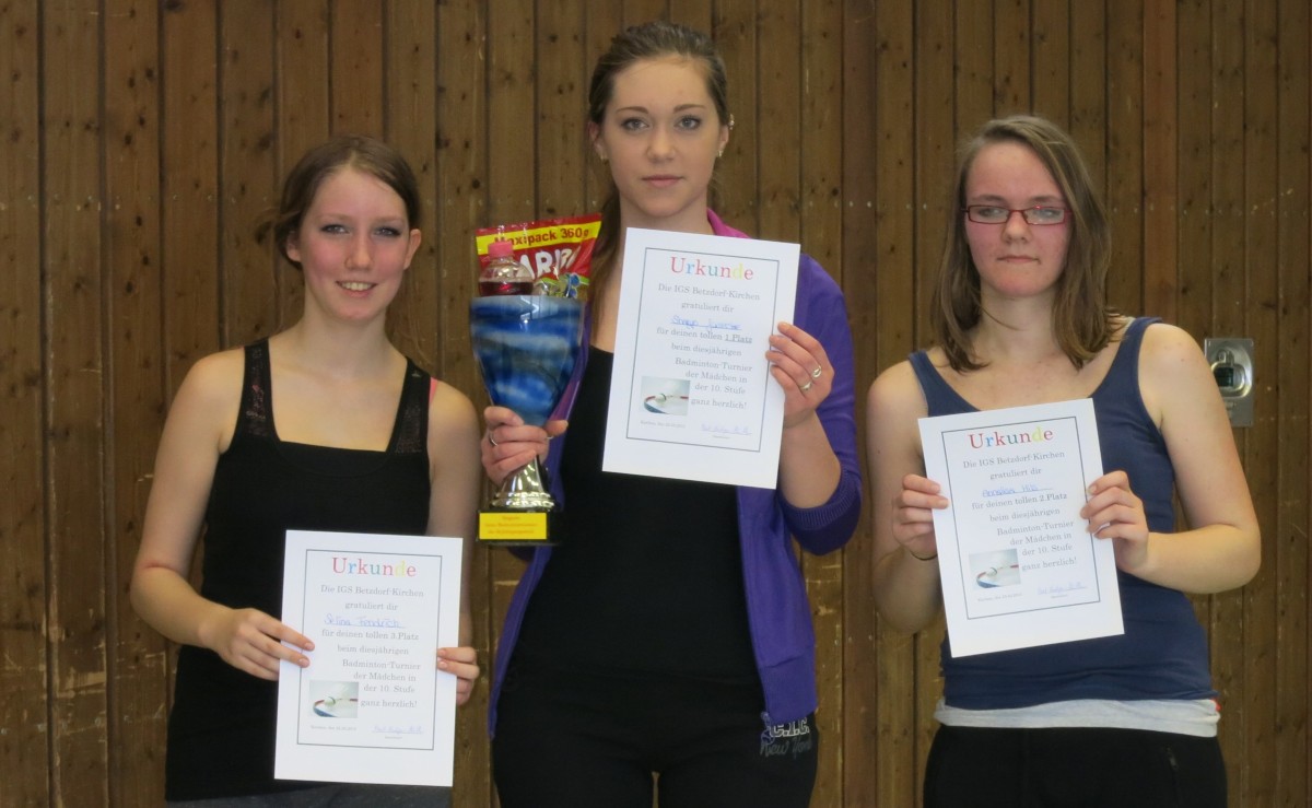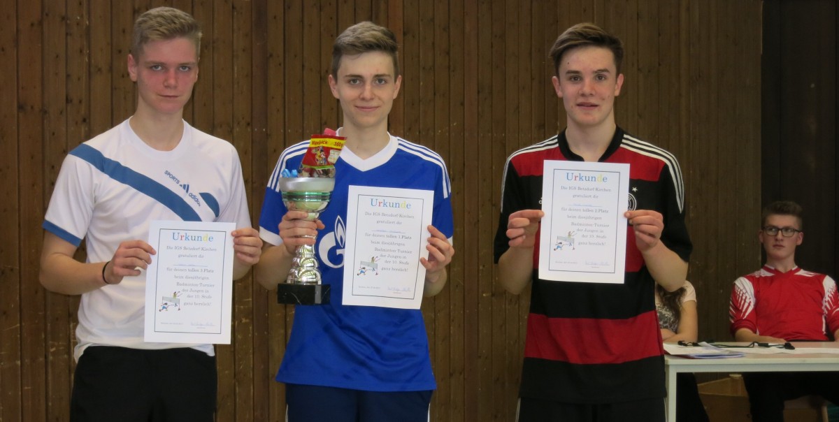 Tolle Leistungen beim Badminton-FußballturnierP.-L.Müller Am letztenTag vor den Osterferien trafen sich die drei Klassen der Stufe 10 zu einem Badminton-Fußballturnier in der Sporthalle in Kirchen. Bei den Mädchen hatten sich 8 Spielerinnen gemeldet, wovon alleine 5 aus der Klasse 10c stammten; bei den Jungs waren 16 am Start. Nach spannenden Vorrundenspielen standen sich in den zwei Halbfinalspielen 4 Mädchen der Klasse 10c gegenüber. So verpasste Selina Fendrich ganz knapp den Einzug ins Finale durch eine 12:10 Niederlage gegen Annalisa Hils. Das zweite Halbfinale gewann Sharyn Giesecke mit 15:9 gegen Miriam Lässig. Im drauffolgenden Spiel um Platz 3 konnte sich Selina Fendrich gegen eine leichtverletzte Miriam Lässig mit 15:9 durchsetzen. Wesentlich spannender verlief das Finale. Nach ständigem Führungswechsel lag am Ende Sharyn Giesecke mit 12:10 nur ganz knapp vor Annalisa Hils. Bei der anschließenden Siegerehrung wurden alle drei mit Urkunden belohnt und die Siegerin Sharyn durfte den gefüllten Siegerpokal mit nach Hause nehmen. Bei denJungs waren 16 Spieler am Start. Nach vielen hochklassigen Begegnungen in der Vor- und Zwischenrunde schafften es Dario Meyer, Leander Orsawa und Louis Lenz, alle aus der 10b, und Mika Mundo aus der 10a in die Runde der letzten Vier. Nach spannenden Halbfinalspielen trafen sich Dario Meyer und Louis Lenz im Spiel um Platz drei wieder. Nach wechselhaftem Spielverlauf hatte am Ende Louis seine Nerven besser im Griff und gewann mit 16:12 das kleine Finale. Im Spie lum Platz 1ging es hoch her. Am Ende setzte sich Leander Orsawa mit seiner taktisch geschickteren Spielweise und unter Anfeuerung seiner Klassenkameraden gegen Mika Mundo mit 12:9 verdient durch. Auch hier durften sich die drei Erstplatzierten über Urkunden und einen gefüllten Siegerpokal freuen. Beim anschließenden Fußballturnier waren bei den Mädchen die Klassen 10a und 10c mit jeweils einem Team am Start, bei den Jungs waren es die 10b und 10c mit einemTeam, die Klasse 10a trat sogar mit 2 Teams an. Bei den Mädchen gab es ein Hin-und Rückspiel. Am Ende setzte sich hier die Klasse 10a verdient mit 4 Punkten durch. Es spielten für die 10a Selina Gehrer, Selina Becher, Leotine Weber, Julia Otterbach und Luca Stricker. Bei den Jungs gab der Spielplan vor, dass jeder gegen jeden spielte. Am Ende hatte die Klasse 10b alle Spiele gewonnen und damit souverän den 1.Platz belegt. Die anderen drei Teams hatten am Ende jeweils drei Punkte und belegten so die Plätze zwei bis vier. Für die Sieger aus der Klasse 10b standen Dario Meyer, Leander Orsawa, Nils Heuer, Lars Heuer, Konstantin Mohr und Moritz Schumann aufdem Feld.