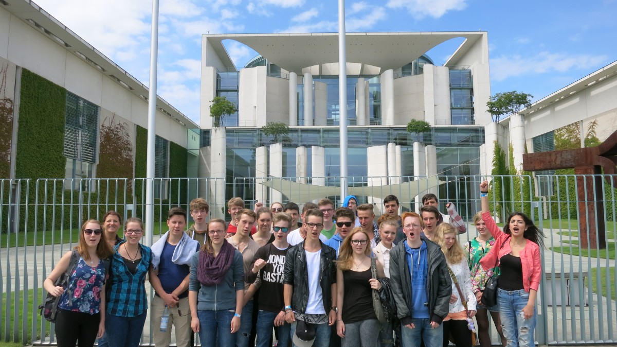 Am Morgen des 22.Juni starteten wir mit unseren begleitenden Lehrern zu einer einwöchigen Klassenfahrt nach Berlin. Auf derHinfahrt besuchten wir das Arbeitslager Buchenwald und informierten uns vor Ort über die Schicksale der damals inhaftierten Häftlinge. Danach setzen wir unsere Reise Richtung Berlin fort. Dort angekommen, bezogen wir zuerst unsere Zimmer im zentralgelegenen City Hostel in Berlin Mitte. Nun ging es an die Erkundung der näheren Umgebung. Hier wurde unser Orientierungssinn stark gefordert. Den nächsten Morgen machten wir uns bei leichten Nieselregen auf zur „Rittersport Erlebniswelt“. Danach gingen wir zum Gendarmenmarkt, wo wir auf dem roten Teppich ein Klassenfoto schossen. Weitere Anlaufpunkte waren Checkpoint Charlie, die Ausstellung „Topographie des Terrors“, der Potsdamer Platz, das Holocaust-Denkmal „Stelenfeld“, das Brandenburger Tor und schließlich das gut gesicherte Hotel Adlon, in dem die Queen während ihrer Deutschlandtour nächtigte. Schon leicht erschöpft ging es weiter zum Bundeskanzleramt, zum supermodernen Berliner Hauptbahnhof und schließlich zum Bus, der auf der „Straße des 17.Juni“ auf uns wartete. Unser Ausflug führte uns jetzt weiter zum Bahnhof Zoo und zur Gedächtniskirche. Nach einigen Erläuterungen bekamen wir dann ein wenig Freizeit zum Verschnaufen. Am späteren Nachmittag fuhren wir weiter ins ehemalige Stasigefängnis „Hohenschönhausen“, in welchem wir eine mehrstündige, jedoch interessante Führung von einem ehemals Inhaftierten erhielten. Der Mittwoch war ein ganz besonderer Tag unserer Klassenfahrt. Die Queen war in der Stadt und wir wollten sie gerne sehen. Also gingen wir früh morgens los zum Spreeufer, um die Queen auf ihrer Bootsfahrt zu begrüßen. Nach längerer Wartezeit kam sie, gemeinsam mit ihrem Mann und unserem Bundespräsidenten Herrn Gauck, an uns vorbeigeschifft. Natürlich konnte sich unser lieber Herr Müller keinen Ausruf verkneifen. Mit „Else,Else“ zog er die Aufmerksamkeit des Bundespräsidenten auf unsere Gruppe und uns wurde von ihm zugewinkt. Auf dem Weg Richtung Wachsfigurenkabinett fuhr die Queen ein weites Mal nur ganz knapp an uns mit ihrem Bentley vorbei. Auch hier erlangten wir mit unserem berühmt-berüchtigtem Zicke-Zacke-Zicke-Zacke-Ruf die Aufmerksamkeit ihrer Majestät. Nach diesem aufregenden Erlebnis besuchten wir „Madame Tussauds“. Von da aus ging es weiter zum Berliner Dom und zum Alexanderplatz, auf dem sich der Weg der Klasse an der Weltzeituhr trennte. Den Mittwochabend lernten einige aus unserer Klasse noch neue Leute aus dem Hotel kennen. Einer von ihnen erhielt von uns den Spitznamen Bobby. Bobby, der Coole, wird uns immer in Erinnerung bleiben. Am Donnerstag fuhren wir zum Mauerdokumentationszentrum in die Bernauer Straße. Später spazierten wir durch den Berliner Tierpark Richtung Spree, um dort bei schönstem Wetter an einer Schifffahrt teilzunehmen. Nach dem Genuss von etwas Freizeit trafen wir uns um 16 Uhr am Paul-Löbe-Abgeordnetenhaus, in dem wir noch eine Mahlzeit zu uns nehmen konnten. Hier wurden wir und unsere Taschen vor Einlass streng kontrolliert. Später wurden wir durch einen unterirdischen Gang zum Reichstag geführt, bei dem wir an einer Informationsveranstaltung auf der Tribüneteil nahmen. Unser Pflichtprogramm endete mit einem Gespräch mit einem Mitarbeiter von MdB Angelika Glöckner. Anschließend besichtigten wir die Kuppel des Reichstages und genossen die Aussicht. Nach einer turbulenten Nacht, in der wir einiges erlebten (wovon wir aber nicht berichten wollen), traten wir am nächsten Morgen den schlafreichen Rückweg in die Heimat an.