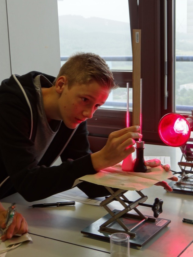 Als die Schüler den Bus verließen, war die Überraschung groß: futuristische Bauten, Container, Straßen, die die Gebäude in Blöcke einteilen, unzählige Computerbildschirme flimmerten durch beinahe jedes Fenster. Ob sich so jemand das DLR vorgestellt hat, jenen Ort an dem der kürzlich von der ISS zurückgekehrte Astronaut Alexander Gerst ausgebildet wurde, wo er täglich über die Straßen joggte und hart für seine Mission im All trainierte? Der Weg führte die Schüler in eine Halle mit massiven Betonwänden, die von außen unscheinbar wirkte. Darin aber sah es geheimnisvoll aus: Versuchsgeräte, riesige Bilder eines Marsroboters und Schautafeln waren zu sehen. Eine gewaltige stählerne Apparatur fesselte bald den Blick der Ankömmlinge. Es war eine Zentrifuge, die in der Mitte der Halle stand, eine Trainingseinrichtung für Astronauten. Wie auf einem Karussell, das sich übermäßig schnell dreht, wird ein Astronaut in solch einem Gerät fest in seinen Sitz gedrückt und muss erfahren, wie sich seine eigene Gewichtskraft um ein Vielfaches erhöht. Experimente im School LabIm Mittelpunkt des Besuchs stand jedoch nicht die Ausbildung von Astronauten, sondern eine Reihe von Experimenten im sogenannten School Lab, dem Schülerlabor des DLR, das in dieser Halle untergebracht ist. Hier können Schüler faszinierende Bereiche der Forschung aus nächster Nähe erkunden und eine Vorstellung davon gewinnen, wie spannend Wissenschaft sein kann. Für die Besucher standen fünf durch Studenten der Physik und Chemie betreute Experimente bereit.